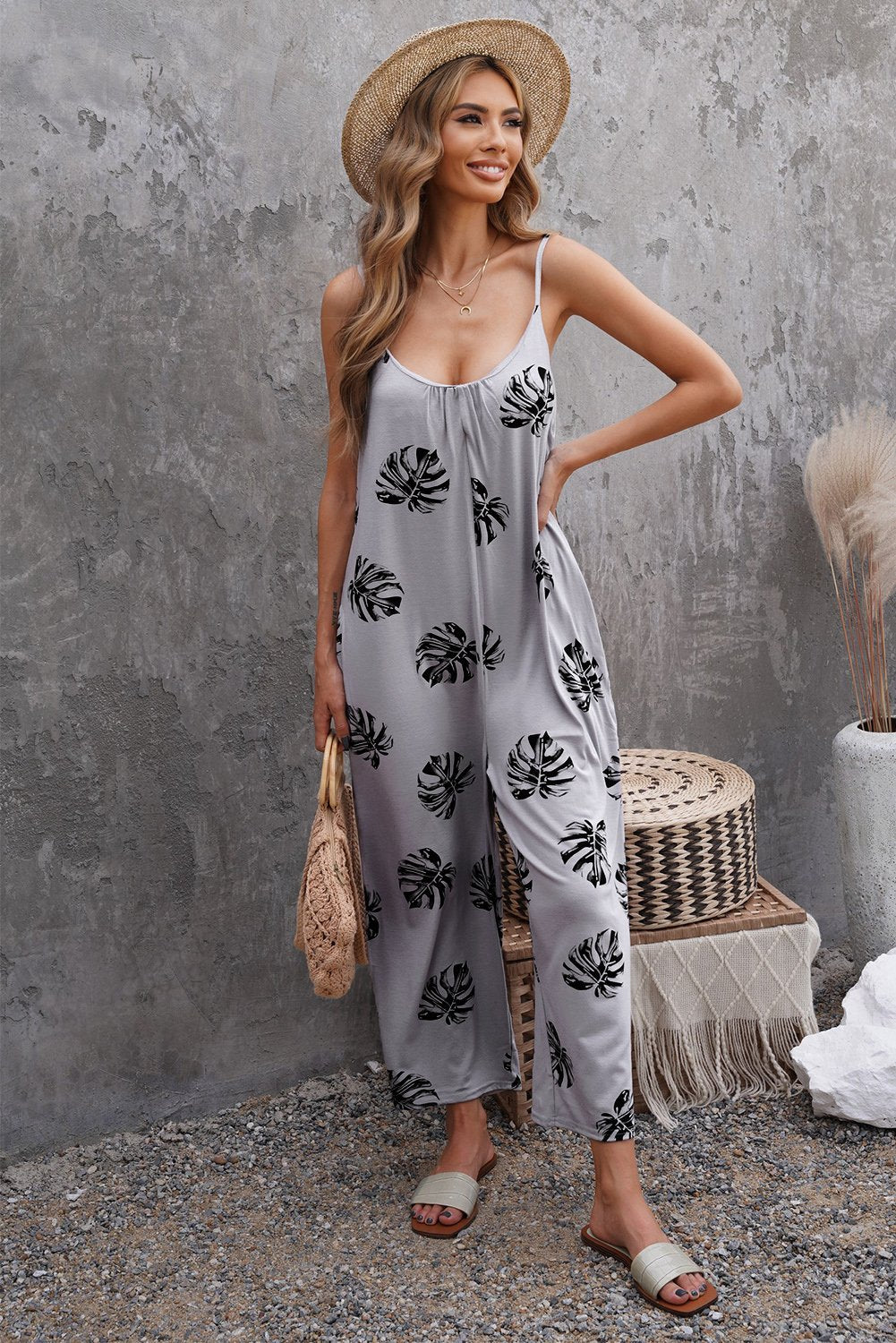 Summer Gray Palm Leaves Print Spaghetti Strap Wide Leg jumpsuit